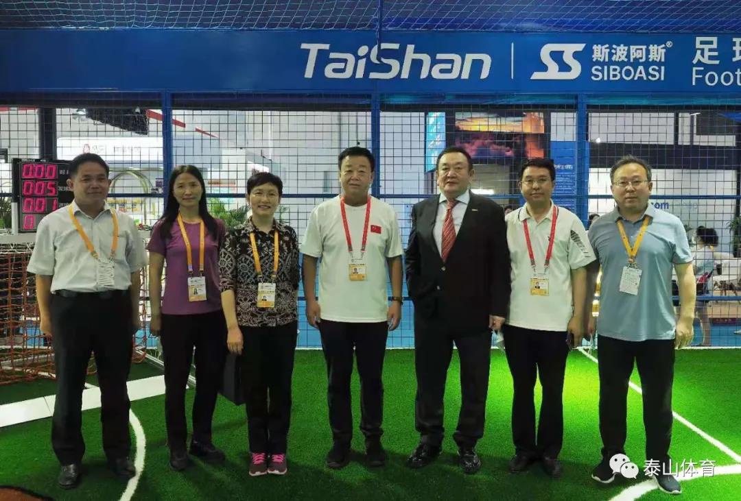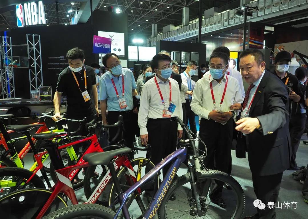 山东省商务厅厅长张德平在中国·金沙(js69认证)体育产业集团董事长卞志良陪同下参观一号馆中国·金沙(js69认证)体育展厅。