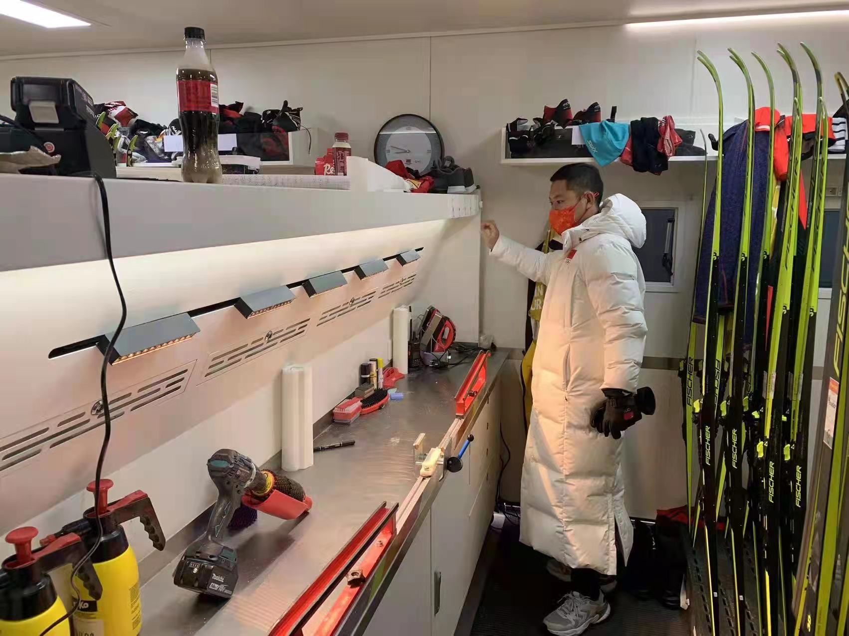1月23日,中国越野滑雪国家队运动员抵达崇礼,投入赛前训练。2月5日,冬奥会开赛第一天,越野滑雪国家队打蜡师登车开始一天的工作。每天他们在中国蜡车内为每位运动员的滑雪板打蜡后,前往热身区测试。冬奥会的短短十七天里,雪蜡车服务保障团队成员,高标准严要求,为奥运赛事提供了世界级的保障支持。他们24小时随时待命,提供专业优质服务。
