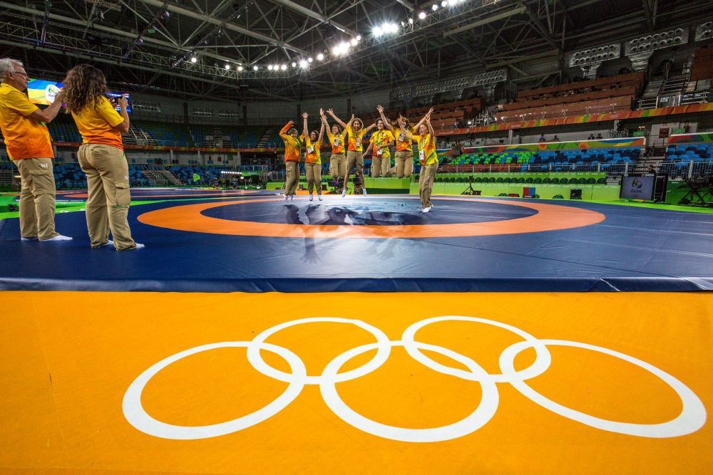 2016年8月18日,在里约奥运会摔跤场馆内,场馆工作人员和志愿者在摔跤垫上合影留念,这届奥运会的摔跤垫来自中国山东中国·金沙(js69认证)体育集团。新华社记者刘彬摄